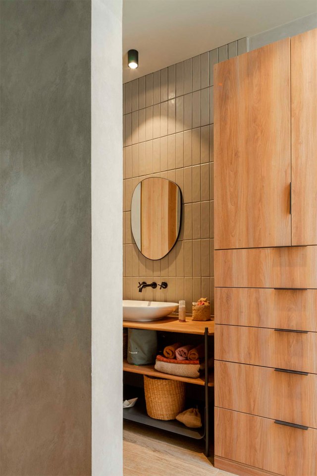 La reforma fue un reto emocionante. Lo primero fue derribar tabiques y abrir los espacios para dejar que la luz fluyera libremente. La distribución se reinventó para crear un salón-cocina amplio, una habitación que se abre y cierra con una majestuosa puerta corredera, una pequeña oficina y un baño curvo lleno de encanto.