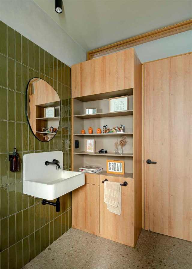 En el baño, el verde menta aporta frescura y refuerza la conexión con la naturaleza. Las ventanas originales se restauraron para conservar el carácter del edificio, mientras que el mobiliario combina piezas funcionales y atemporales, como el sofá Martina en beige de Kave Home o la mesa de centro de The Masie.