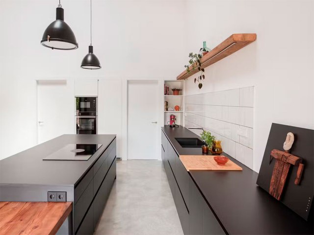 Para la cocina se utilizaron muebles metálicos en color negro que combinan a la perfección con la madera y el tono de la viguería. Una gran isla central y un solo frente de armarios bajos es suficiente para albergar todo lo necesario. Al no poner almacenaje superior, se enfatiza visualmente la altura de los techos. Para iluminar la zona de trabajo se ha recurrido a luminarias de tipo fabril, así como una tira de led empotrada en la balda que hace de separación entre la zona de azulejos y la pared (en la parte del fregadero).