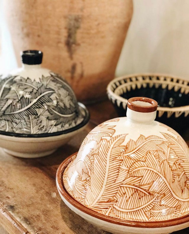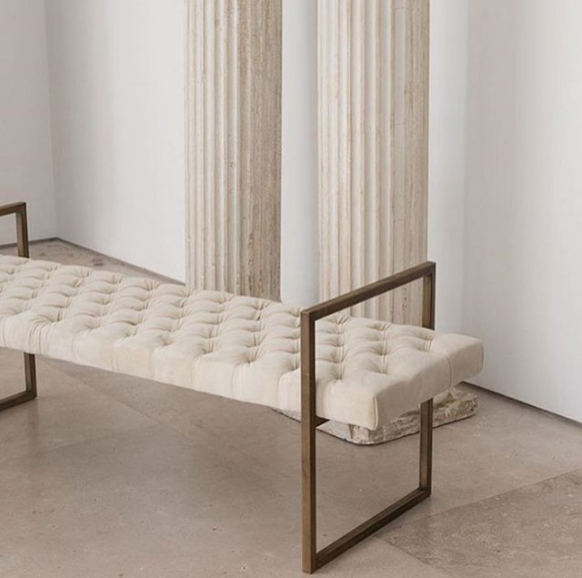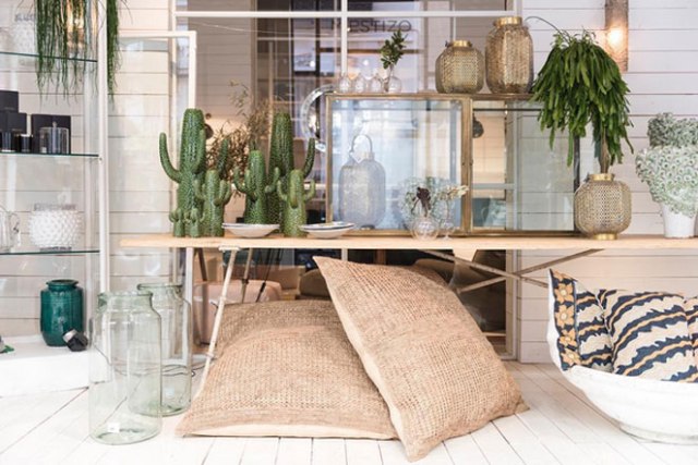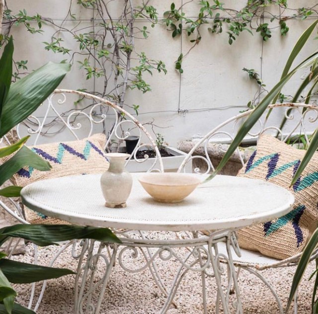 Podemos encontrar maravillosos textiles procedentes de la India, tajines de barro del norte de África, tinajas y piezas de alfarería, mobiliario de ratán o rafia, pufs de sisal perfectos para exterior, pero también otros inspirados en los 70´ en terciopelo rosa o verde, emblemáticas sillas de Willy Rizzo en acero y ante, o importantes piezas como una cómoda italiana del Siglo XVII en su sección de antigüedades. He visto también mobiliario más contemporáneo, como el banco de capitoné con patas en hierro que luce en la casa del famoso interiorista Luis Puerta.