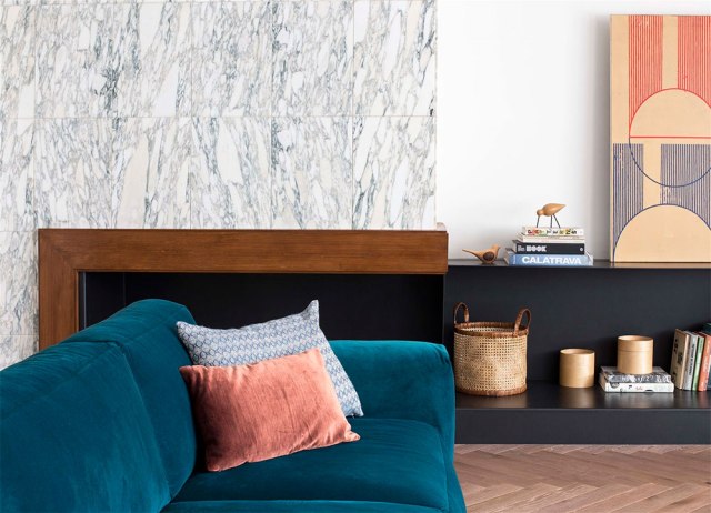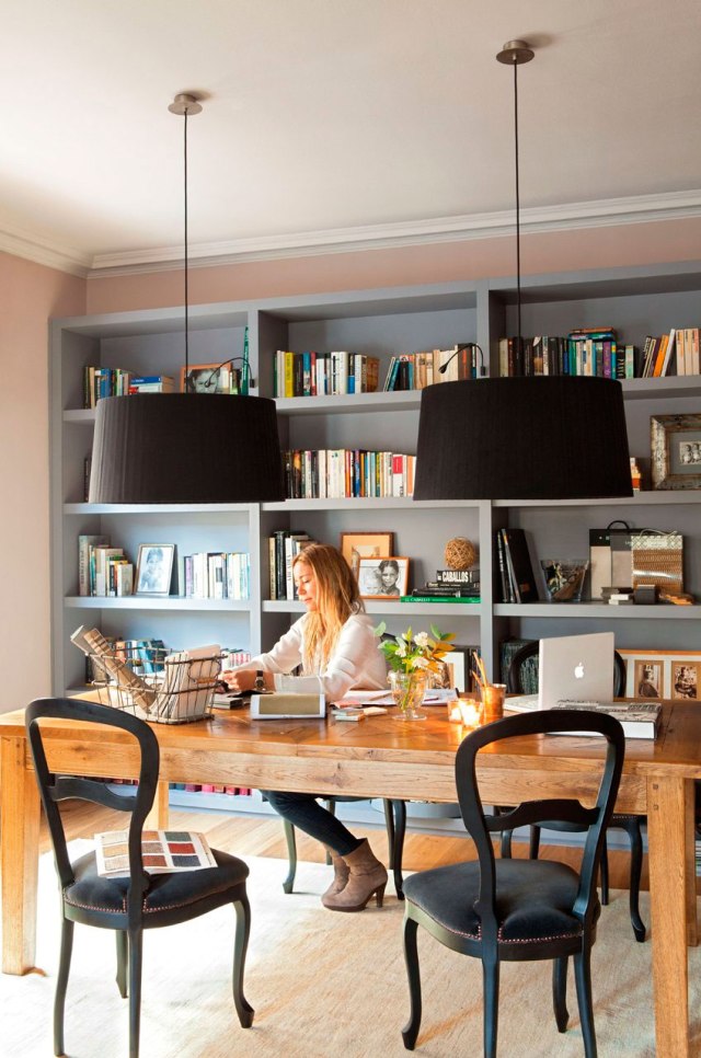 Ahora, desde el recibidor se pueden ver todos los espacios conectados. Por un lado, de frente se divisa el jardín y a ambos lados del recibidor, un salón con chimenea y un gran comedor que, aunque parezcan independientes, se pueden cerrar a demanda mediante puertas correderas. Tras el sofá encontramos una gran librería, diseño del estudio, que a su vez oculta la escalera que lleva al segundo piso. En ella albergan su gran colección de libros, así como piezas de arte a las que le tienen mucho cariño, como la talla religiosa.